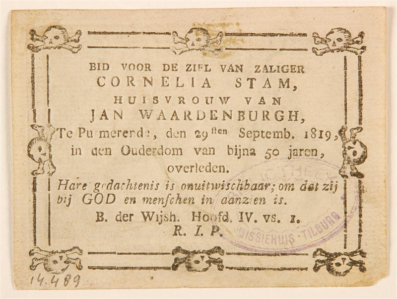 - BeschrijvingDoodsprent van Cornelia Stam (1769-1819). Voorstelling: Christus zit op een wolk en heeft zijn rechterarm om een kruis geslagen. Hij geeft een stralend hart een persoon, die hem zijn hart overhandigt. De tekst luidt: "Dilectus meus mitri et Ego illi".
