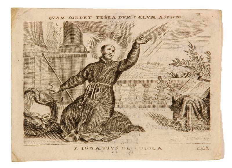 Doodsprent van Petrus Johannes Heuvelmans (1769-1823). Voorstelling: de heilige Ignatius van Loyola ontvangt goddelijke inspiratie. Hij valt knielend ter aarde. Voor hem bevindt zich een soort tak waarover een slang kronkelt die een appel in zijn bek houdt. Achter de heilige bevinden zich een stoel en een doek. Op de stoel ligt een open geslagen boek. De scène speelt zich af in een architecturale omgeving, die naar buiten uitkijkt.