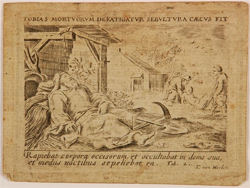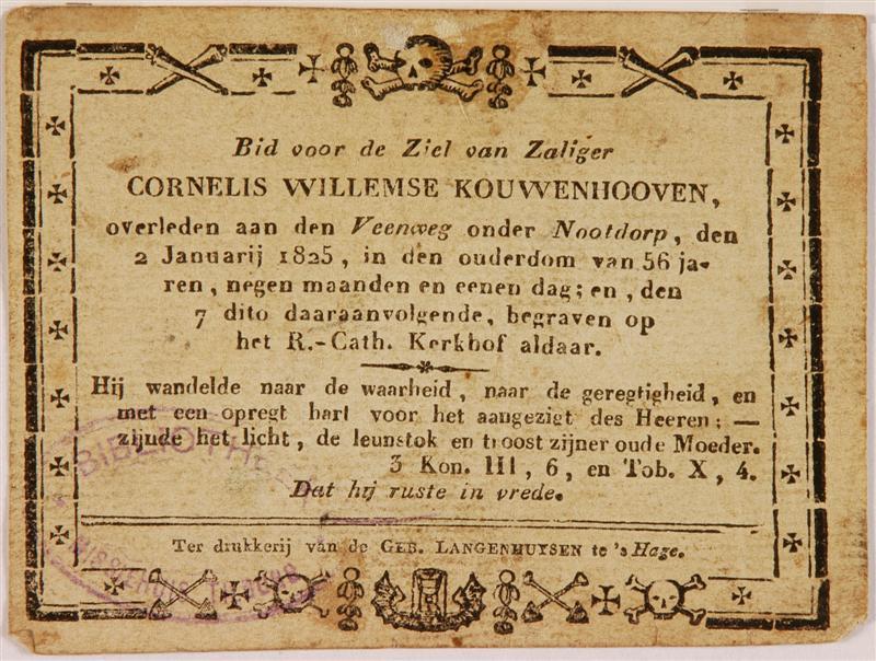 Doodsprent van Cornelis Willemse Kouwenhooven (1779-1825). Voorstelling: uitbeelding van de dood en de graflegging van de heilige Tobias. De tekst boven de tekening luidt: "TOBIAS MORTUORUM DEFATIGATUR SEBLUTURA CAECUS FIT". De tekst onder de tekening luidt: "Rabpiebat corpora occisorum, et occultabat in domo suo, / et mediis noctibus sepeliebat ea.".