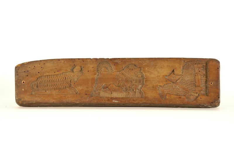 - Beschrijvingvoorkant: 1. karnster 2. marskramer 3. reiskoets met koetsier achterkant: 1. liggende koe 2. hond met mand 3. Lam Gods