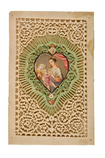 Centraal in een rechthoekig vlak, gevuld met knipwerk, bevindt zich een stralend hart met binnenrand van plantenstengels, die voortkomen uit een hart met een bloem. Het hartmedaillon toont Maria en Kind met een engel. Het knipselwerk is het rechthoekig vlak bestaat eveneens uit twijgen die voortkomen uit een hart met een bloem. Centraal boven het hart staat een brandend hart met kruis. Daar weer boven bevindt zich een duif in een stralenkrans.