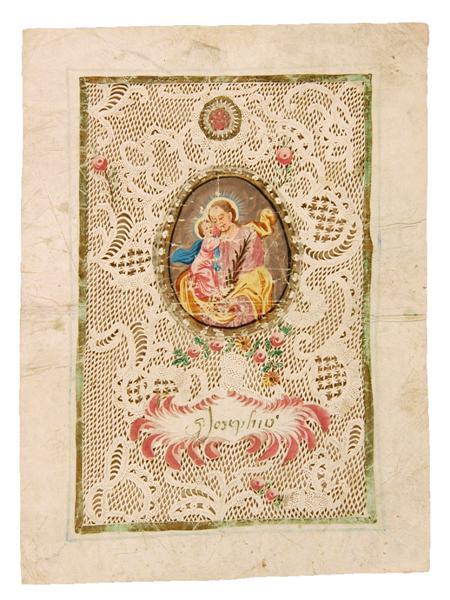 Centraal staat een medaillon met daarin afgebeeld de zittende Jozef met het Christuskind op schoot. In de linkerhand houdt hij een palmtak. Boven het medaillon is een oculus met daarin een hart waarop een kruis staat. Het geheel is gevat in een rechthoek, gevuld met kantwerkimitatie en met maaswerk, waarin een onduidelijke structuur te zien is van plantenmotieven. Centraal beneden is een plaquette met de tekst: "S. Josephus".