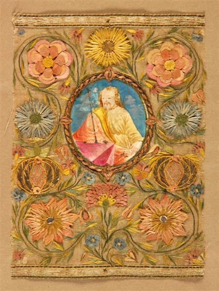 - BeschrijvingCentraal staat een medaillon met een Christusfiguur. Het medaillon heeft een gevlochten rand, die op vier plaatsen is gemarkeerd. Rond het medaillon zijn uit stukjes papier bestaande bloemen aangebracht: tien grote en 24 kleine. De bloemen worden met elkaar verbonden door een lange stengel. Aan de boven- en onderzijde van de prent bevindt zich een bies.