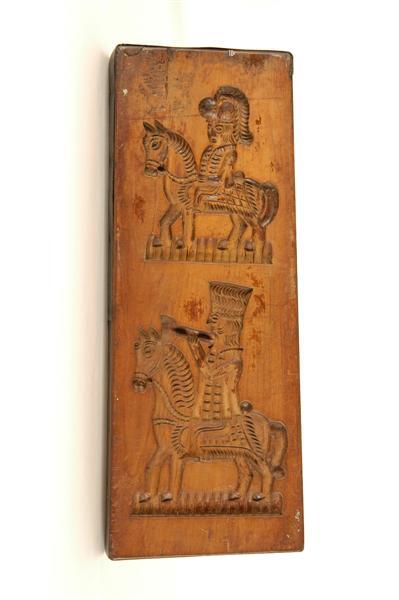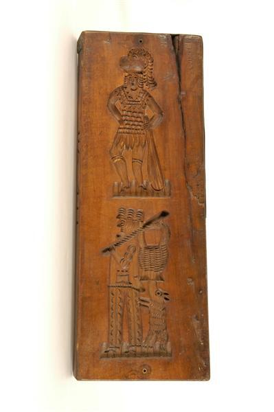 - BeschrijvingVoorkant: 1. ruiter 2. heraut te paard Achterkant: 1. man met handen in de zij (wildeman) 2. marskramer met mand aan een stok over de schouder en opspringende hond