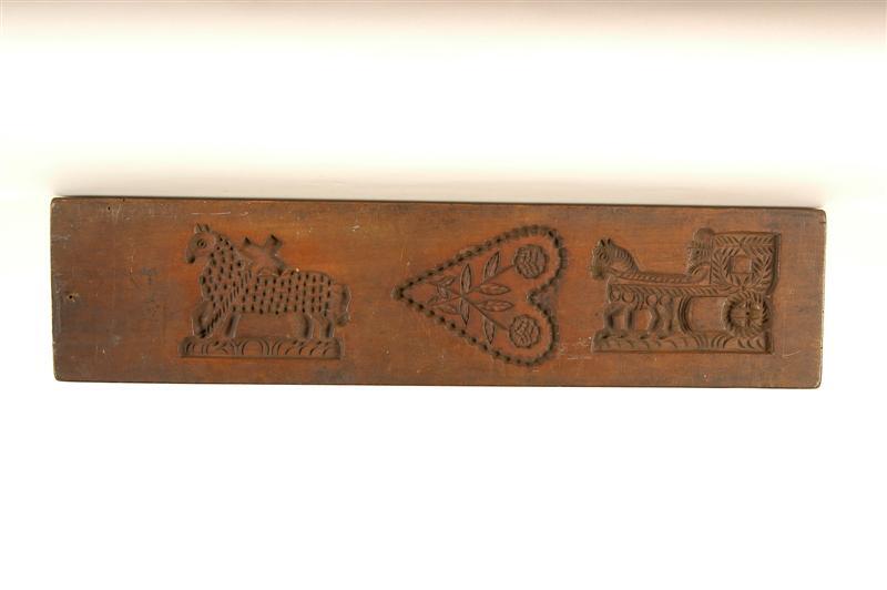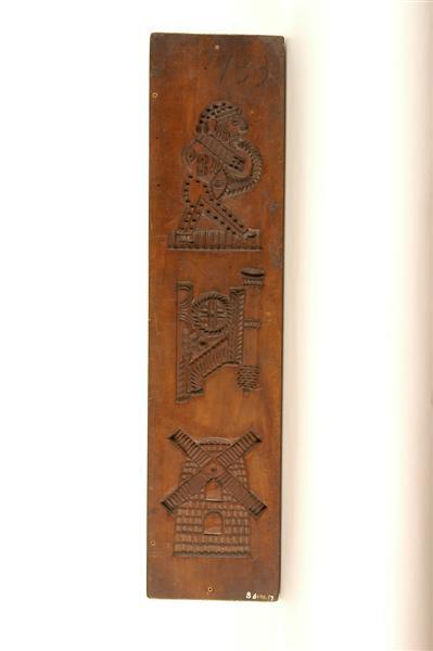 - Beschrijvingvoorkant: 1. Lam Gods 2. hart versierd met bloemen (dwars) 3. reiswagen met koetsier, door een paard getrokken achterkant: 1. harlekijn 2. geschut op wagen 3. molen