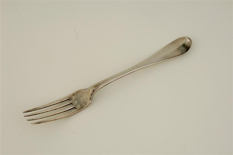 Zilveren vork met 4 tanden.