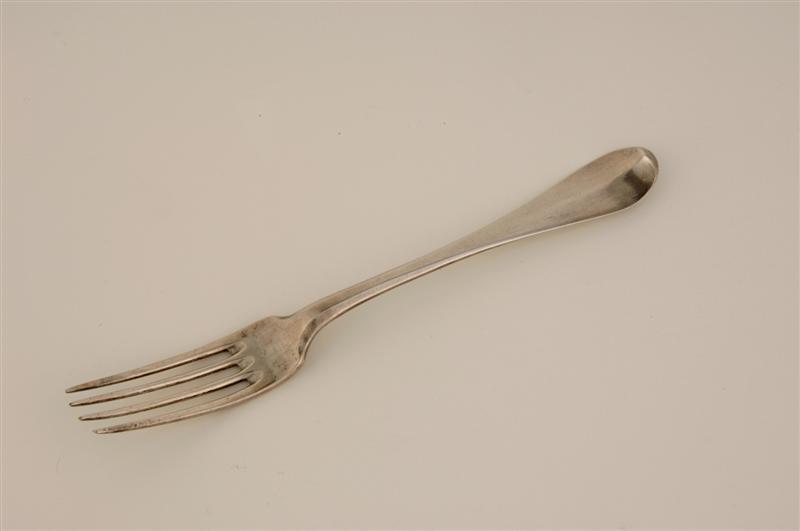 Zilveren vork met 4 tanden.