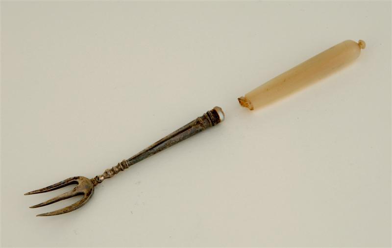 - BeschrijvingEen zilveren zuurvorkje, met parelmoeren heft.