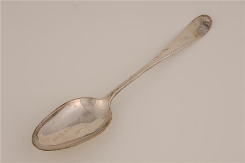 - BeschrijvingZilveren lepel met Haags Lof en spits toelopende bak.