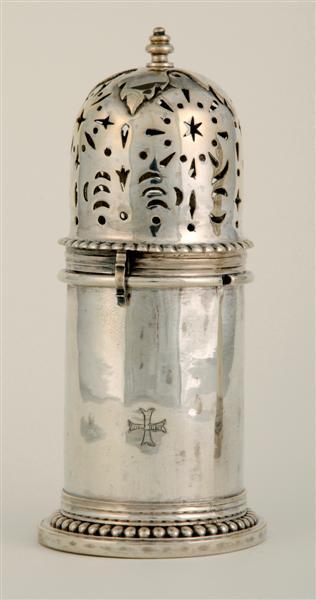 Cylindervormige strooier op ronde voet met parelrand. Scharnierende deksel met parelrand en voorzien van strooigaten in vorm van blaadjes en sterretjes. Bovenop vier eikebladeren, bekroond door ingesnoerd knopje. Op het lichaam het Groot Gasthuis-kruisje gegraveerd. Balustermodel.