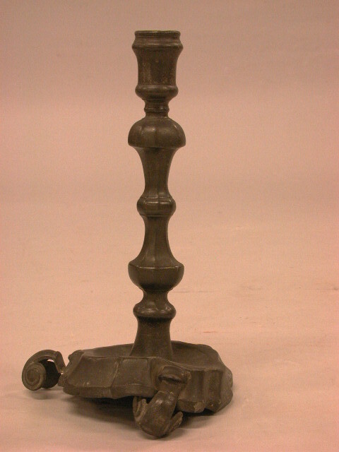 - BeschrijvingTinnen kandelaar bestaande uit een voetstuk met drie gekrulde pootjes, waarvan één ontbreekt, en een lange kaarsenhouder waarvan de schacht wordt onderbroken door talrijke geprofileerde ringen.