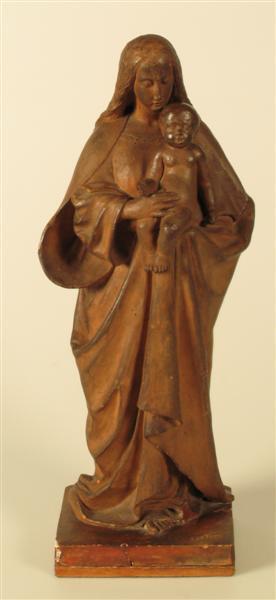 - BeschrijvingStaande Maria. Zij houdt het Christuskind op haar linkerarm.