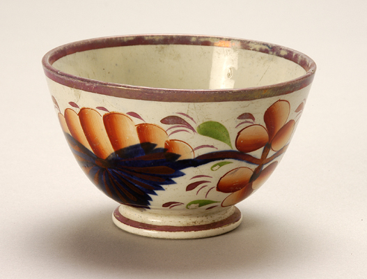- BeschrijvingOorloze kom op concave voetring, op de buitenzijde een bonte florale beschildering in rood, groen, blauw, paars en goud op een wit fond. Behorend tot een set van 4 (6557-6560)