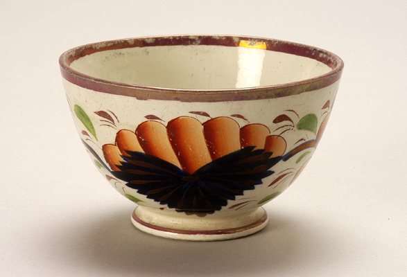 - BeschrijvingOorloze kom op concave voetring, op de buitenzijde een bonte florale beschildering in rood, groen, blauw, paars en goud op een wit fond. Behorend tot een set van 4 (6557-6560)