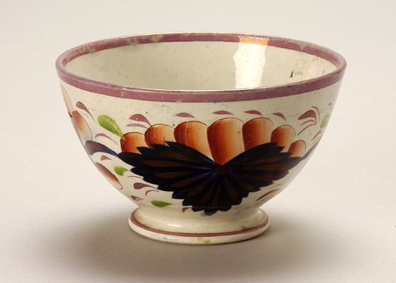 - BeschrijvingOorloze kom op een concave voetring, op de buitenzijde een bonte florale beschildering in rood, groen, blauw, paars en goud op een wit fond. Behorend tot een set van 4 (6557-6560)