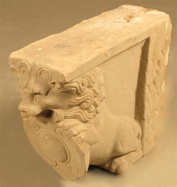- BeschrijvingLos bovenstuk met zittende leeuw als schildhouder fakkeldragende karyatide, ornament met leeuwekop. Voetstuk ontbreekt. Vormt een paar met inv.nr. 1424. Vgl. inv.nrs. 1420-1422, 1425, 1426. Bovenstuk ingeschreven onder inv.nrs. 1433-1438