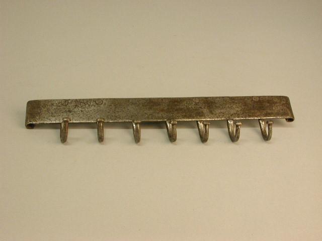 IJzeren band, met naar achter omgeslagen hoeken, waaraan 7 ijzeren haken met knop