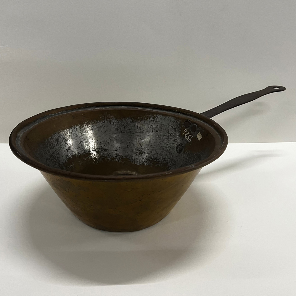 - BeschrijvingGeelkoperen steelpan, inwendig vertind, met vlakke bodem, schuine wand en met 3 roodkoperen nagels bevestigde platte ijzeren steel met oog.