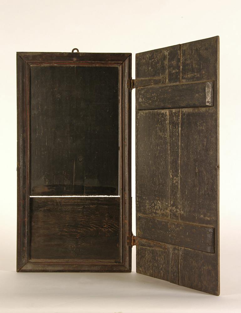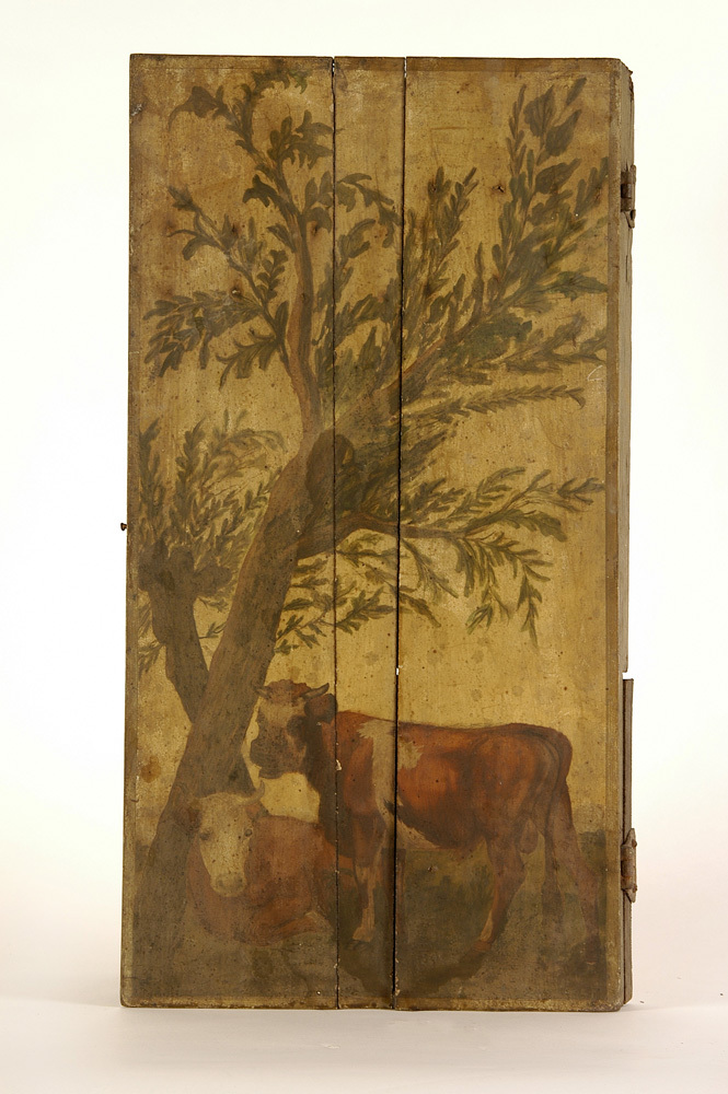 Ondiep kastje met scharnierend deurtje met voorstelling van twee koeien in landschap