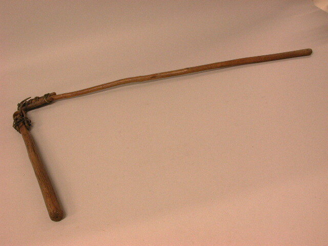 Perehouten stok en fruitboomhouten klopper, verbonden middels twee houten beugels, touw en een leren riem.