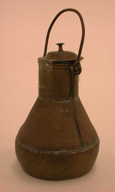 - BeschrijvingRond scheerketeltje en licht uitbollende buik tot 4,5 cm hoogte. Hierop (met naad) kegelvormig lichaam tot 10,5 cm hoogte, waarop met naad, de 5 cm hoge hals aansluit. Gewelfde deksel met knopje. Langs hals en lichaam twee aan de bovenzijde tot ogen gebogen staven, waaraan het staafvormige, gebogen hengsel is bevestigd.