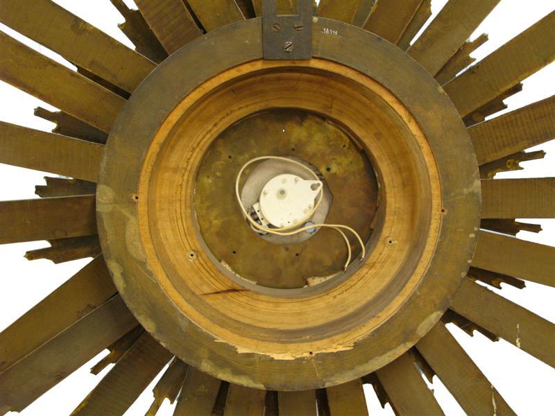 - BeschrijvingZonneklok, met uurwerk in een stralenkrans, bestaande uit twee kransen van stralen van verguld hout, het uurwerk voorzien van een parelrand.