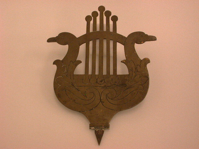 - BeschrijvingVaandelstokbekroning in de vorm van een lier. De lier is aan beide zijden voorzien van een zwaan.