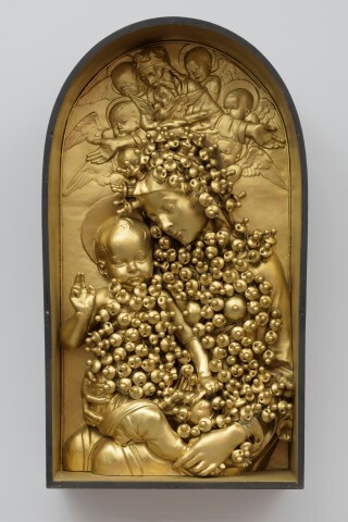- BeschrijvingMadonna-reliƫf naar Lucca della Robbia, vermaakt tot pop-art beeld door het toevoegen van spenen en goudverf, in kast van zwartgeverfd hout en plexiglas.