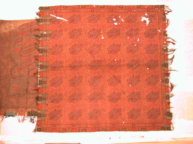 Wollen omslagdoek. Inslag in de kleuren zwart, wit, blauw, rood, groen en geel. Ketting bedrukt, grotendeels in rood, doch ter hoogte van de omranding en de harlekijnranden in de hoofdkleuren van de mihrabs. Grondweefsel in platbinding. Het veelkleurige patroon bestaat uit regelmatig naast elkaar geplaatste, op palmetten geïnspireerde motieven (2 verschillende, zich steeds herhalend). Om het grote patroon een fantasierand, daaromheen een harlekijnrand. Het doek wordt aan twee zijden begrensd door een zelfkant en aan de andere twee zijden door franje, gevormd uit de kettingdraden. Algemeen: een 'Mihrab' is een poortvormige bidnis in een moskee. Dit type doek wordt ook palmdoek, kommadoek, gestoken doek, worteldoek of Brabantse doek genoemd.