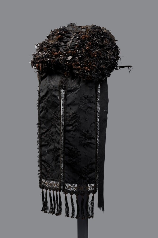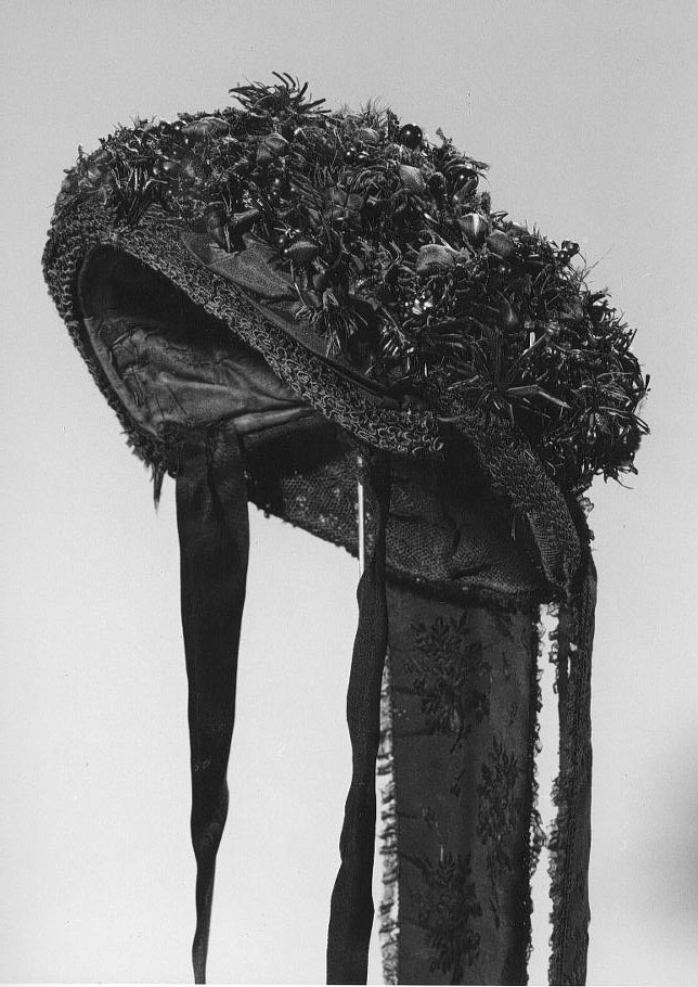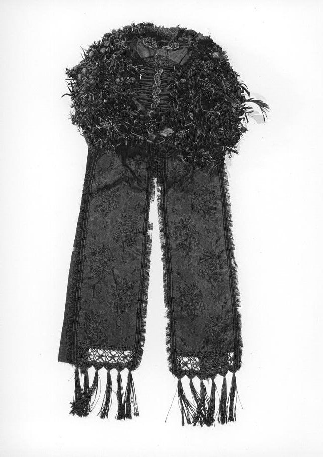 De versieringen van de muts zijn genaaid op een "hoedje" van gewaste katoen, verstevigd met stijve tule (2 soorten: grof en fijn). Langs de voorrand van het "hoedje" drie over elkaar liggende geplooide voorstroken. Langs de onderrand een strook gaas (luifke) verstevigd met ijzerdraad (laiton?). Over luifke en voorstroken een machinaal kantje. Op de beide zijden boven de voorstrokken lussen van ribzijden lint. Achter de voorstroken een rand van veertjes, pareltjes, gitjes, kraaltjes, wasbloempje, zijden bloemetjes ('kussentjes'), chenilledraad en papier. Daarachter een opstaande rand van gaas, verstevigd met ijzerdraad waarover twee machinale kantjes. Middenachter deze kantjes, op de bodem, een strik van zijden striklint, versierd met een klein strikje van chenilledraad en paillettenband. Achter de strik en over de bodem een machinaal kantje en een gerimpeld strook katoenen satijn, in het midden versierd met paillettenband. Aan de onderzijde van deze strook een strik van zijden riblint met bloemmotief versierd met chenilledraad en kraaltjes. Aan beide zijden van de gerimpelde strook een brede toef bloemen, veertjes enz. (als de rand achter de voorstrikken). Middenachter, over het luifke, twee afhangende strikken van zijden riblint met bloemmotief, aan de onderzijden versierd met kant en flossen, langs de zelfkanten met een smal kantje en een gerimpeld zijden strookje. Twee striklinten van zijden riblint.