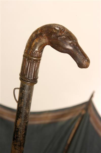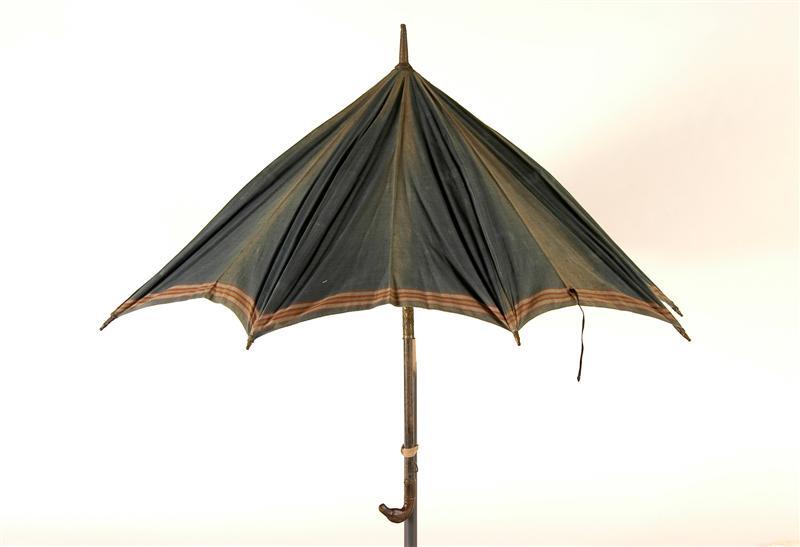 - BeschrijvingBoeren paraplu met bruin hoornen handvat in de vorm van een paardenhoofd. Scherm van blauwe katoen met ingeweven rand in rood, wit, geel en bruin. Houten stok met koperen huls en punt versierd met drijfwerk. Houten baleinen waaraan gedraaide metalen stangetjes. Koperen punten aan de baleinen. Bandje met knoopje om paraplu te sluiten.