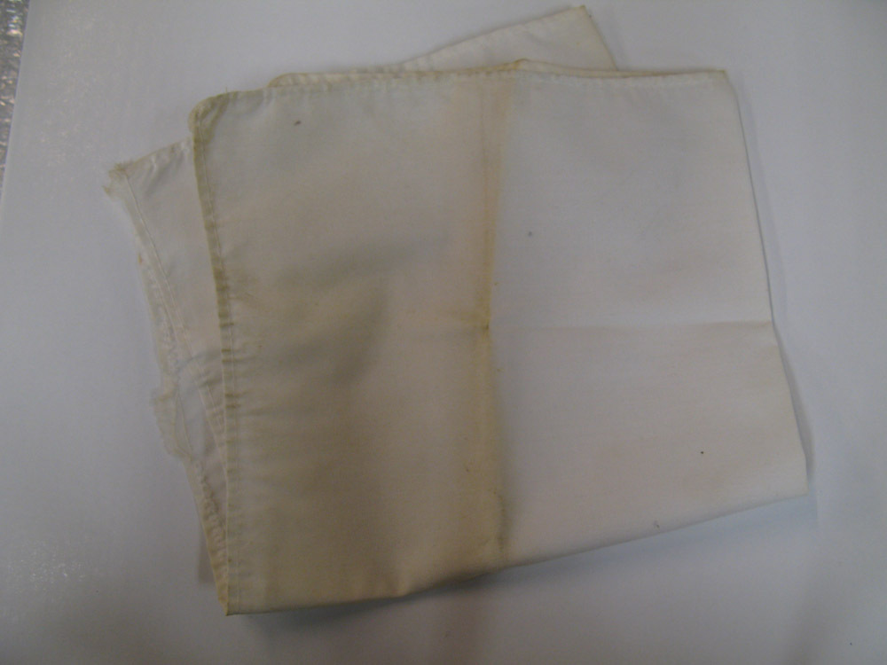 - BeschrijvingWitte katoenen doek, wellicht een zakdoek, gevonden in het bovendepot van het museum bij diverse tinnen voorwerpen. Bij de zakdoek ook het bidprentje van Franciscus Adrianus van Engelen. Wellicht is er een connectie met het tin. IS 2009-10-14
