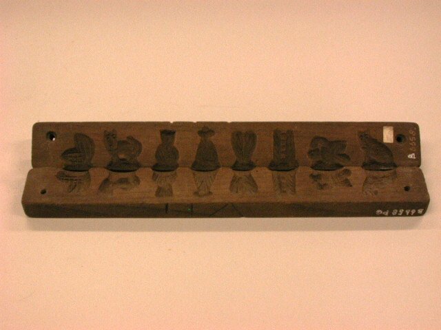 - BeschrijvingTwee identieke plankjes met touw verbonden dat door gaten geregen is. Onderaan gaten voor een pen Binnenkanten: 1. bootje 2. hond 3. fles 4. bel 5. hart 6. (?) 7. vogel 8. kat