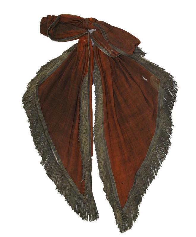 - BeschrijvingStrik van oranje wollen stof, afgezet met geblokt zilverband en franje om de slippen (materialen als van vaandel). Slippen afgeschuind.