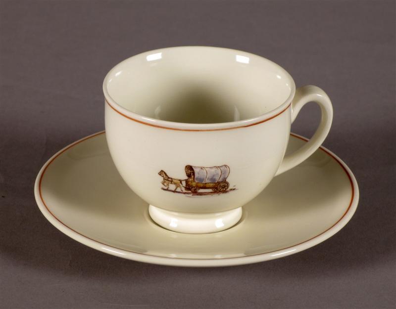 Op het kopje is een huifkar voortgetrokken door een paard afgebeeld. Aan de bovenzijde is rondom een roodbruine sierstreep aangebracht.