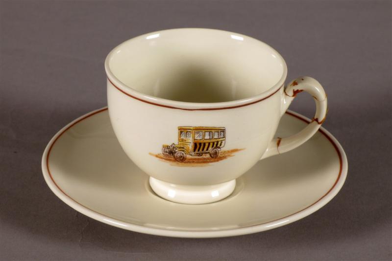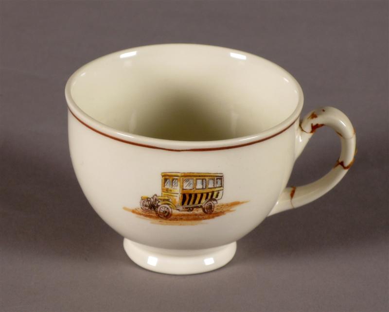 Op het kopje is een gele automobiel afgebeeld. Aan de bovenzijde is rondom een roodbruine sierstreep aangebracht.
