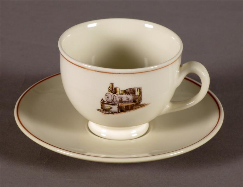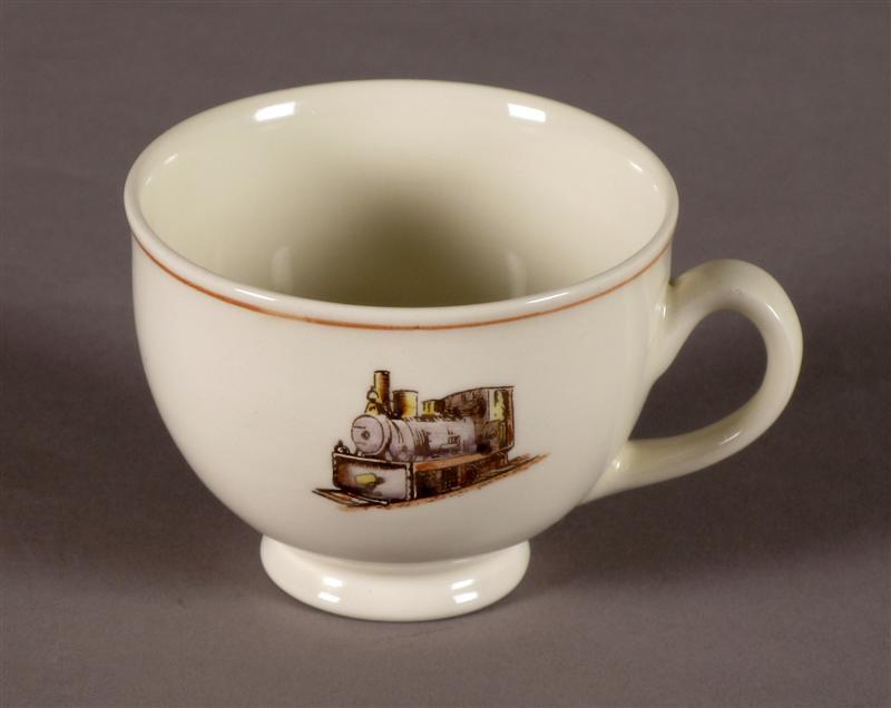 Op het kopje is een stoomlocomotief afgebeeld. Aan de bovenzijde is rondom een roodbruine sierstreep aangebracht.