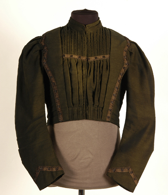 - BeschrijvingZwarte wollen (tebé?) jak en rok. Jakje met sluiting middenvoor. Aan weerszijden van sluiting een geplooide baand waarlangs een kraag. Versierd met fantasieband. Rok, glad aan de voorkant, geplooid aan de achterkant. Een klein opnaadje. Langs de zoom aan binnenzijde gevoerd met een strook donkerblauwe katoen.