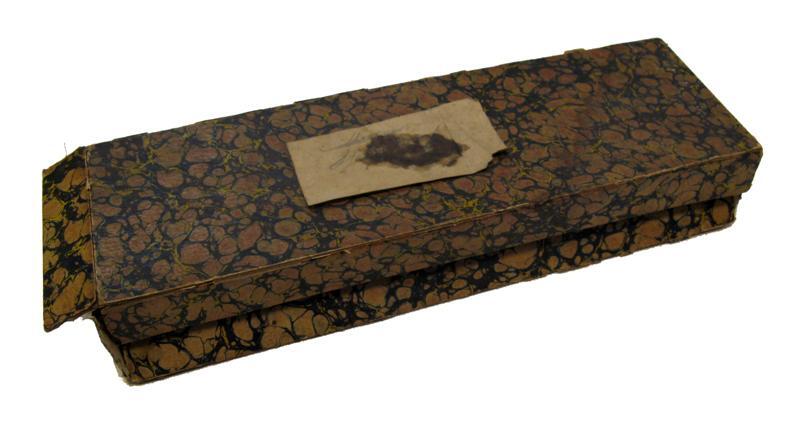 Doosje met deksel van gemarmerd karton. Etiket op deksel. Tekst onleesbaar.