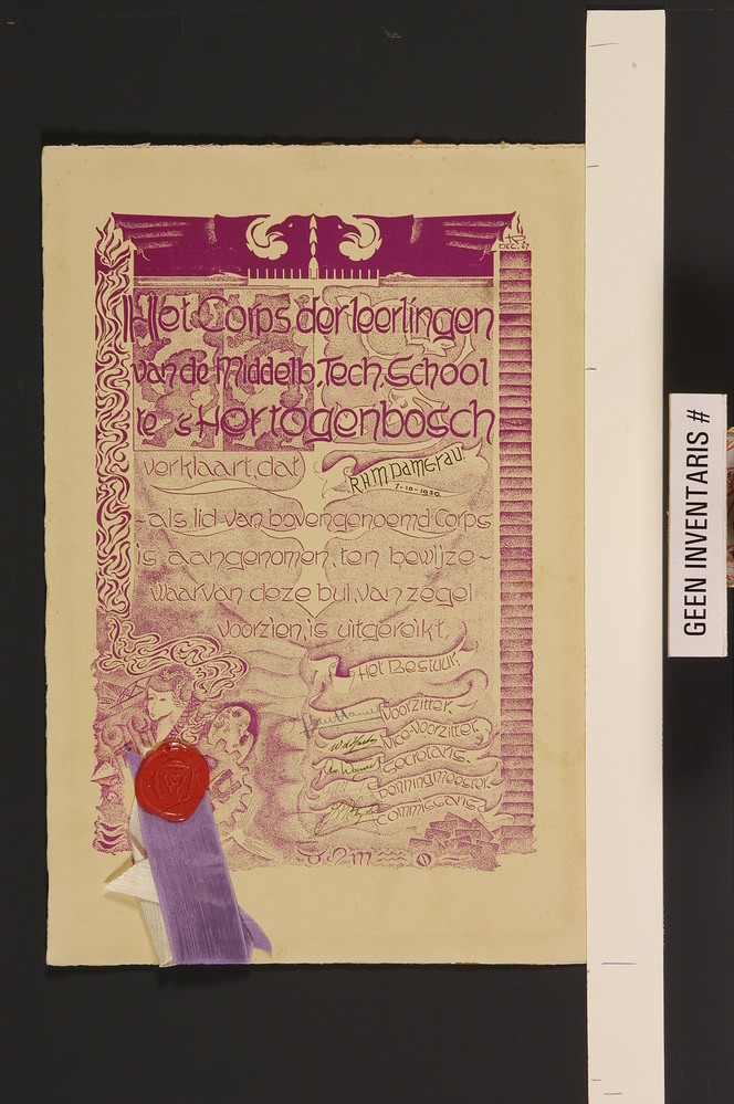Bul van het Corps der Leerlingen van de Middelbare Technische School te 's-Hertogenbosch, uitgereikt aan R.H.M. Damerau