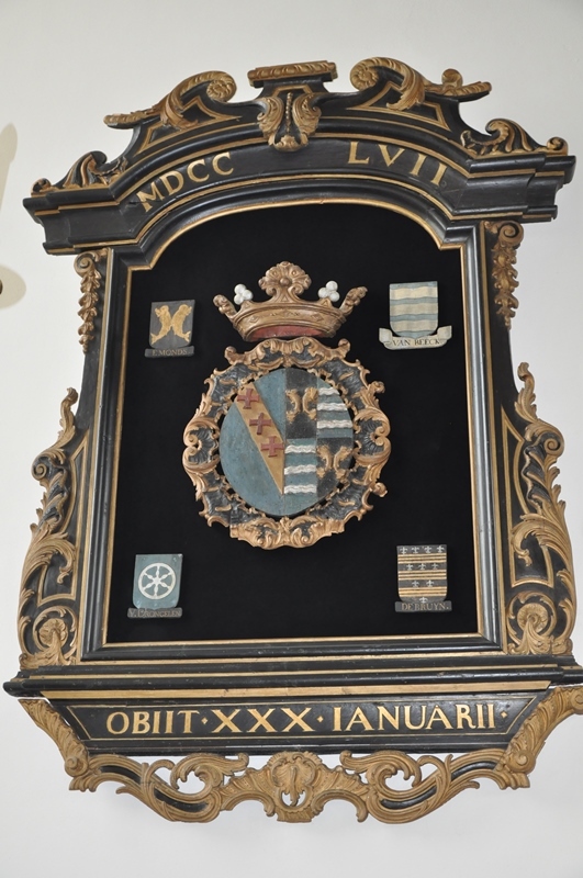 Zwart rechthoekig rouwbord met gewelfde bovenzijde en rijke ornamentering in overgangsstijl Lod. XIV-XV rondom, goud beschilderd. Op de gebogen bovenlijst: MDCCLVII. Op de rechte onderlijst: OBIIT XXX IANUARII. De achtergrond van de wapens bekleed met een moderne, rood-bruine katoenen (?) stof. Centraal: gekroond ovaal, geheel in reliƫf uitgevoerd wapen, gedeeld, rechts Cousebant (gouden schuinbalk met 3 rode Griekse kruisen op een blauw veld), links gevierendeeld Emonds en Van Beeck. Rondom vier kwartieren geschilderd en vlak. 1. Emonds: twee paalsgewijs afgewende gouden vissen op zwart. 2. Van Beeck: drie zilveren gegolfde balken op blauw. 3. Van Drongelen: zesspakig zilveren wiel op blauw 4. De Bruyn: drie gouden gegolfde balken, waartussen 10 witte weerhaken (4, 3, 2, 1) op zwart.