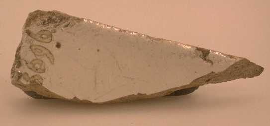 Tegel met voorstelling van kerkje, hek en 2 scheepjes, blauw op wit. Geen hoekfiguren