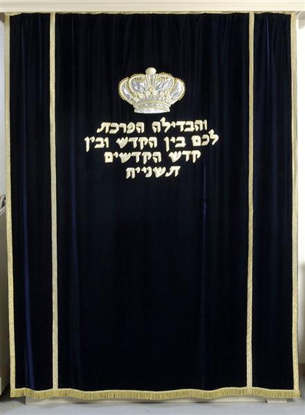 - BeschrijvingNieuwe voorhang van blauw fluweel met geappliqueerde kroon en Hebreeuwse tekst en twee verticale banen van passement van goudkleurig metaaldraad, voering van blauw katoen.