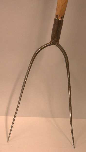 - BeschrijvingEen ijzeren vork met 2 lange hoekige, kromme tanden. In een ronde dichtgesmede huls steekt een lange houten steel.