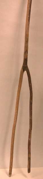 - BeschrijvingSchudgaffel "gemaakt" van een vorkvormig stuk hout. Tweetand van ontbast stuk natuurlijk gegroeid hout.