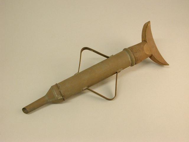 - BeschrijvingBlikken cilinder met afdraaibaar trechtervormig voorstuk en twee grote, hoekige zijoren. Houten zuigerstang met sikkelvormig uiteinde waartegen met met borst of schouder kan duwen