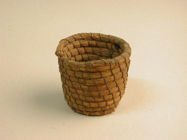 Rond bakje, bekervormig, met vlakke bodem, van spiraalsgewijs, met touw omvlochten grasbundels.