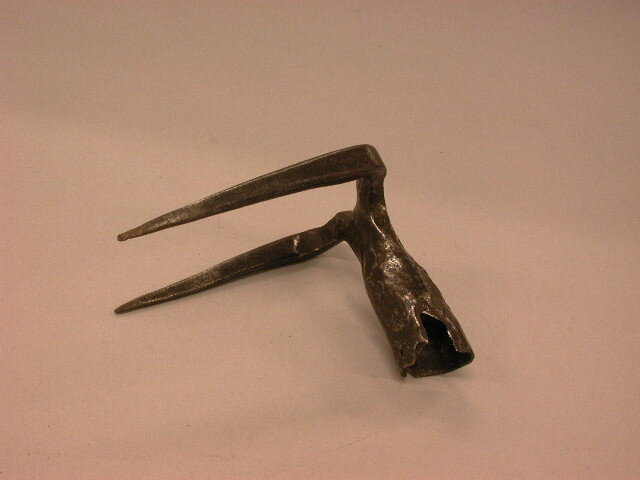 - BeschrijvingTweetandige mesthaak met stevige, hoekige tanden die in een hoek van bijna 90º staan op een lang huis met één nagelgat aan de onderzijde.