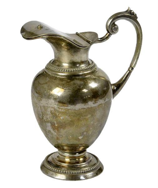 - BeschrijvingKleine bolle zilveren kan op ronde voet met parelrand, voluutvormig handvat en scharnierende deksel, parelrand om de hals.
