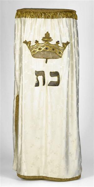Toramantel van witte zijden damast met ingeweven bloemmotiefje en onderste deel van effen witte zijde, geplooid model met harde top en korte zijsplitten en op de voorzijde een kroon als symbool voor de Tora [wet] van goudkleurig en zilverkleurig metaaldraad en diverse gekleurde steentjes en onder de kroon twee Hebreeuwse initialen voor: "Keter Tora" van zilverkleurig metaaldraad.